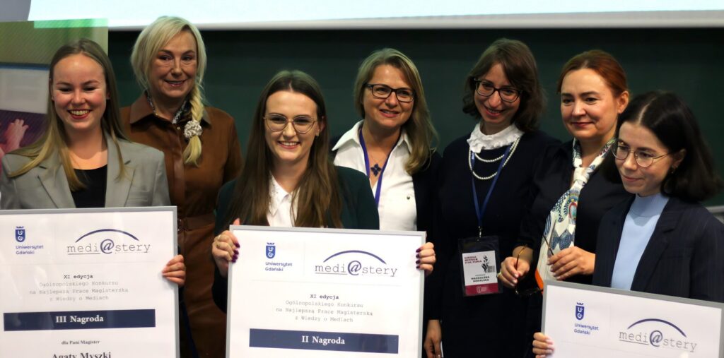 Ważnym momentem konferencji jest wręczenie nagród laureatom ogólnopolskiego konkursu Medi@stery za najlepszą pracę magisterską z wiedzy o mediach. Konkurs jest cyklicznie organizowany przez Instytut Mediów, Dziennikarstwa i Komunikacji Społecznej UG i został zainicjowany w celu promowania najwybitniejszych prac absolwentów magisterskich studiów dziennikarskich. Laureatką pierwszego miejsca w 11. edycji konkursu została Anna Grabowska za pacę: „Art. Branding – promocja przez sztukę. Charakterystyka i analiza zjawiska w oparciu o wybrane przykłady” (promotor: dr hab. Weronika Świerczyńska-Głownia, prof. UJ, Uniwersytet Jagielloński). Drugie miejsce zajęła Anna Kulma za pracę „Media społecznościowe jako instytucja socjalizacji politycznej na przykładzie młodzieżówek polskich partii politycznych” (promotor: prof. dr hab. Agnieszka Hess, Uniwersytet Jagielloński). Trzecie miejsce przypadło Agacie Myszce za pracę: „Zmiany w języku polskich ogłoszeń o pracę w latach 1995-2024. Analiza porównawcza” (promotor: dr hab. Magdalena Hodalska, prof. UJ, Uniwersytet Jagielloński). Nagrody wręczyły: dyrektorka Instytutu prof. Małgorzata Łosiewicz oraz wicedyrektorka – dr hab. Anna Ryłko-Kurpiewska, prof. UG. Rozmowę z laureatkami poprowadziła Paulina Kozień, studentka dziennikarstwa i komunikacji społecznej UG. Główną nagrodą dla laureata pierwszego miejsca jest publikacja zwycięskiej pracy w formie książki, a w czasie uroczystości wręczenia nagród Medi@stery publiczność ma możliwość wysłuchania fragmentów wydanej pracy z poprzedniej edycji. W tym roku odczytany został fragment książki Agnieszki Kurpias: „Krytyka literacka w mediach społecznościowych” (promotor prof. dr hab. Iwona Hofman, Uniwersytet Marii Curie-Skłodowskiej w Lublinie), która została laureatką konkursu w 2024 roku.